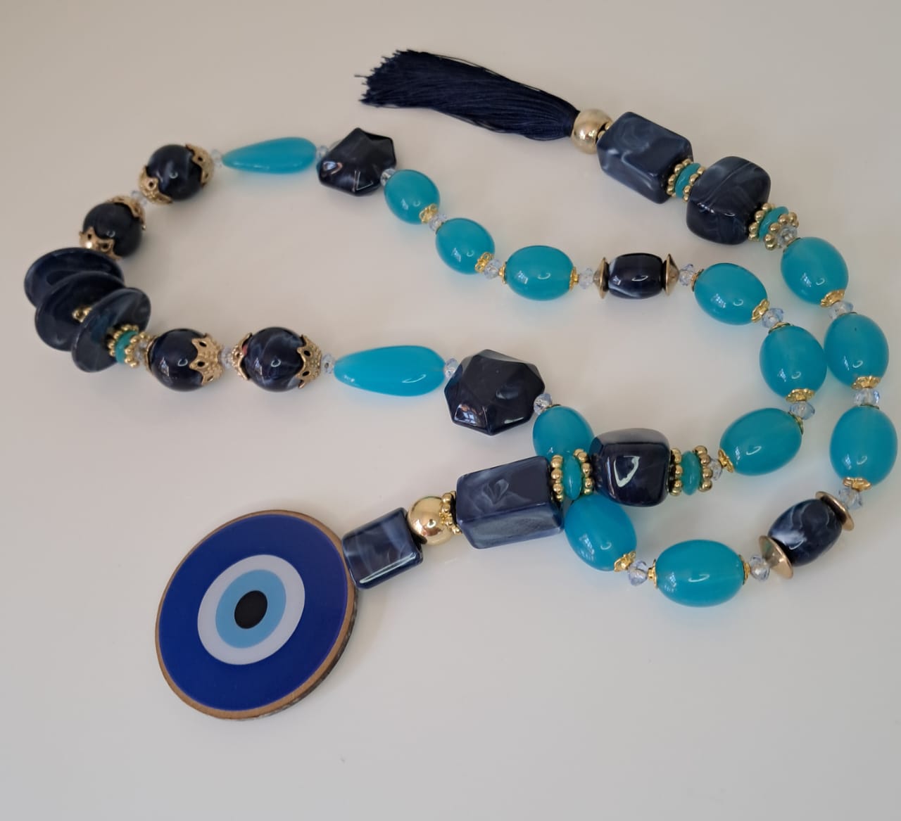 Não se sabe exatamente como o Olho Grego surgiu, mas foram encontrados registros de seu uso datados 5.000 anos antes de Cristo. Ganhou muita popularidade nos paises árabes e Turquia, por isso também é conhecido como Olho Turco. Neste colar, ele vem em formato de medalha e finaliza uma das pontas, adicionando um charme extra a esta peça. A outra ponta é finalizada com um tassel de seda na cor marinho. No corpo do colar, mesclam-se resinas em varios tons de azuis, intercaladas por pequenos cristais, que o tornam ainda mais especial.