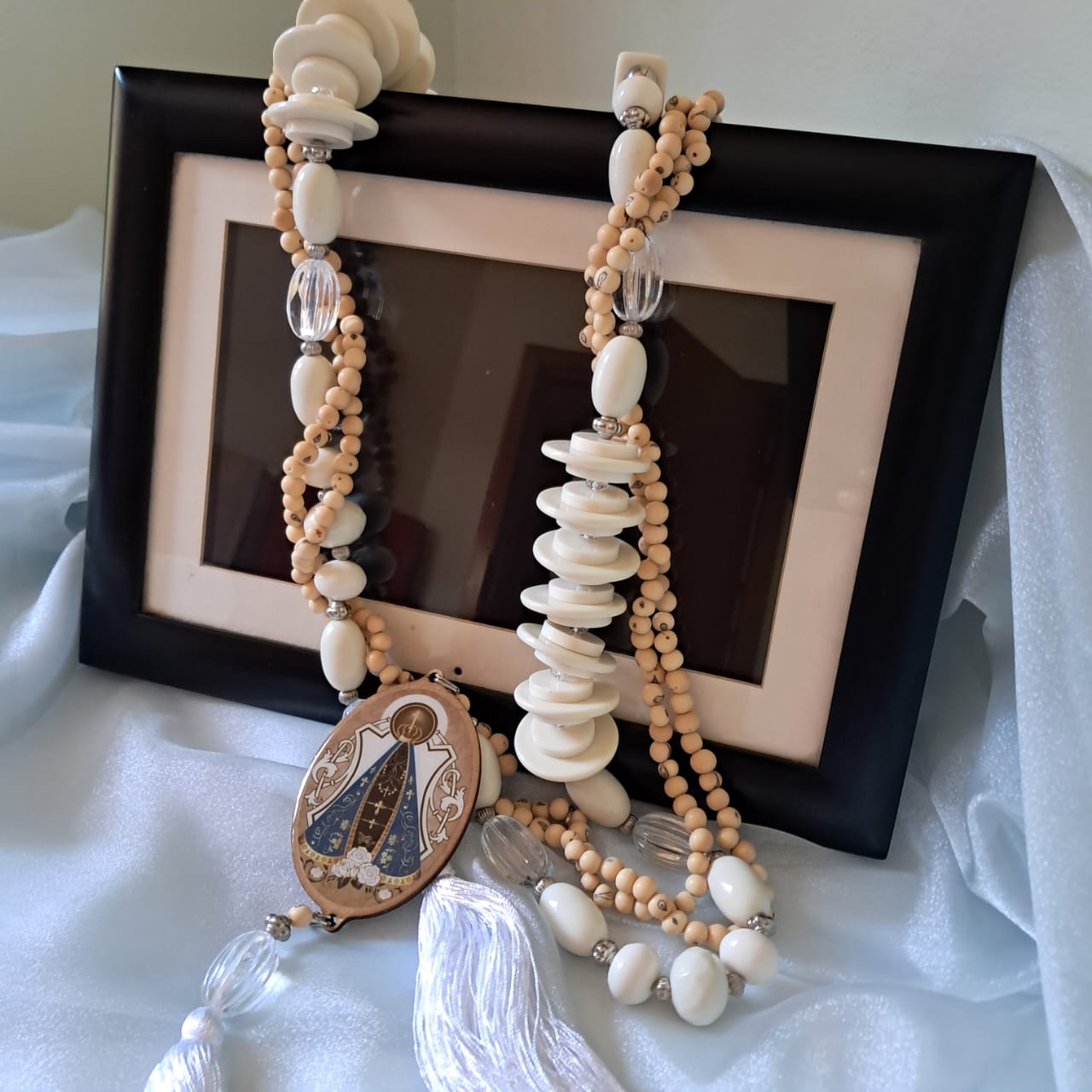 Produto artesanal, confeccionado na cor branca, em resinas, sementes de açaí e cristais. Destaca-se pela sua elegância e acabamento refinado, com 2 tasseis de seda brancos. Em uma das extremidades, desponta uma medalha de Nossa Sra.Aparecida, em resina. Ideal para decorar mesa de jantar, aparador, hall de entrada ou dormitórios.